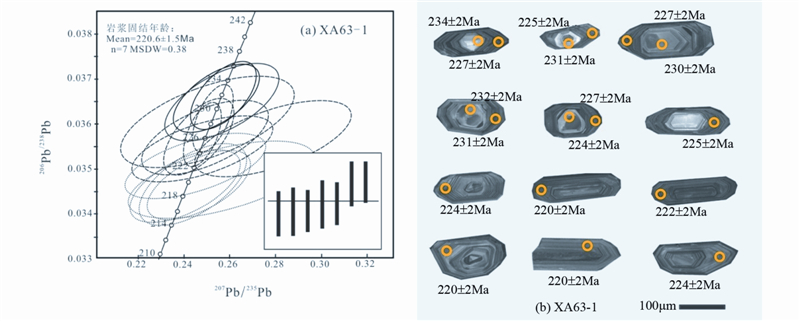 ![]() | 图 4 花岗闪长岩(XA63-1)典型锆石CL图像和锆石U-Pb谐和图 Fig. 4 Zircon CL images and U-Pb concordia diagram for granodiorite(XA63-1) |