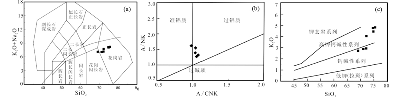 ![]() | 图 5 香日德晚三叠世花岗岩分类图解 (a)-花岗岩TAS分类图(Middlemost,1994);(b)-A/CNK-A/NK(据Sh and ,1927);(c)-SiO2-K2O(据Richwood,1989) Fig. 5 Classification diagrams for Xiangride area intrusive rocks |