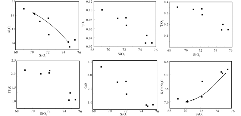 ![]() | 图 6 香日德岩岩体哈克图解 Fig. 6 Harker diagrams of major elements for Xiangride intrusive rocks |