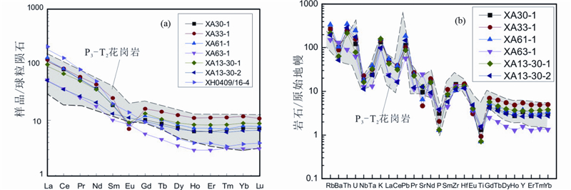 ![]() | 图 7 香日德岩体岩石稀土元素球粒陨石标准化配分图和微量元素原始地幔标准化蛛网图(标准化值据Sun and McDonough, 1989) Fig. 7 Chondrite-normalized REE patterns(a) and primitive mantle-normalized multi-element diagrams(b)for the Xiangride area intrusive rocks(normalization values after Sun and McDonough, 1989) |