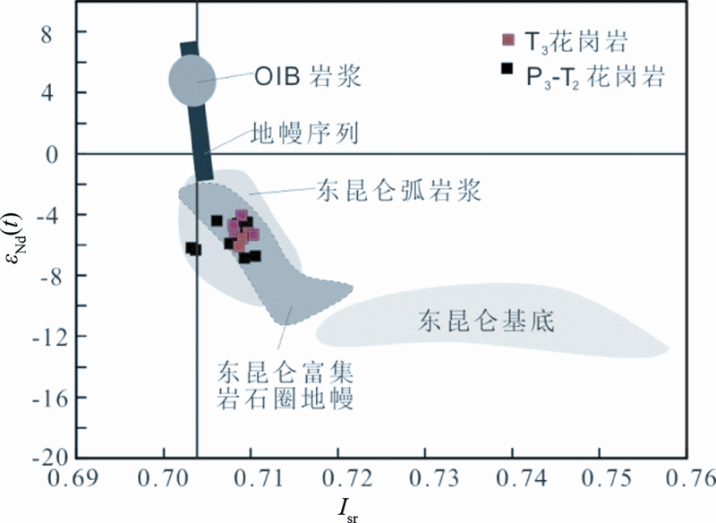 后碰撞的动力学条件下加厚地壳的拆沉作用以及俯冲板片的断离均可以引起幔源岩浆上涌并底侵下地壳。就一般情况来说,由拆沉作用形成的岩浆岩多呈面状分布(Mahéo et al., 2009),而与板片断离作用有关的岩浆岩多呈线性分布,且经常造成地壳沿着平行于缝合带的方向发生抬升(Blanckenburg and Davies, 1995; Altunkaynak,2007; Neilson et al., 2009; Duretz et al., 2011)。通过我们对东昆仑东段花岗岩时空展布情况的分析,清楚地表明早期(P3-T2)花岗岩主体沿昆北断裂带两侧呈东西向的线性展布。但是,晚三叠世花岗岩(~230Ma)的空间分布则跨越了昆北-昆南构造带并延伸至布青山地区,呈面状出露的特征很明显。由此我们初步推断,东昆仑地区晚三叠世花岗岩浆作用可能主要与岩石圈的拆沉作用有关,也是对自晚海西期以来幔源玄武质岩浆长期的底侵作用及地壳不断加厚的一种响应。 5 结论