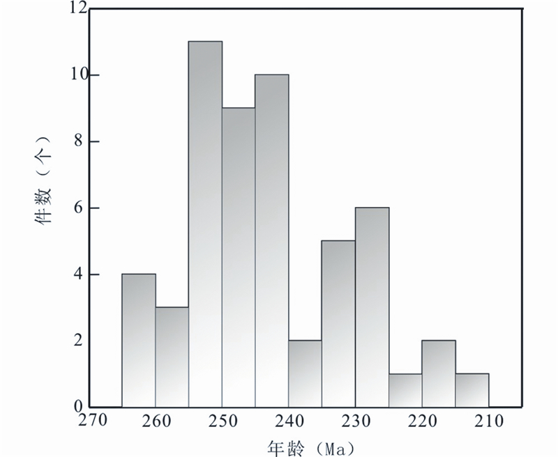 东昆仑造山带分布了大量晚海西期-印支期花岗岩。根据对近些年高精度锆石U-Pb年龄数据的统计,表明东昆仑地区的花岗岩主要形成于260~220Ma之间(图 9)。其中又以P3-T2的花岗岩出露面积最大,晚三叠世花岗岩多以小岩体的形式侵位于早期花岗岩中。以往人们根据香日德岩体南侧哈拉尕吐地区出露的闪长岩的年龄数据(锆石U-Pb定年为252Ma,殷鸿福等,2000),将香日德地区花岗闪长岩-二长花岗岩的形成时代定为晚二叠世。本次研究获得该花岗闪长岩中锆石U-Pb定年结果为220.6±1.5Ma,二长花岗岩的定年结果为223.2±1.7Ma,表明该岩体的形成时代应是晚三叠世。此外,陈宣华等(2011)报导了香日德镇公路旁花岗闪长岩的锆石U-Pb年龄为228.8±3.7Ma;刘成东等(2003b)、Zhang et al.(2012)、陈国超等(2013)、李佐臣等(2013)、奚仁刚等(2010)、吴祥珂等(2011)、王秉璋(2012)和丰成友等(2012)也先后发表了有关东昆仑地区晚三叠世花岗岩的资料。为此我们推测,晚三叠世很可能也是东昆仑地区花岗岩浆作用的高峰期之一,依据对已有的高精度同位素年龄数据的统计,初步确定晚三叠世岩浆活动的时期在230~220Ma左右。