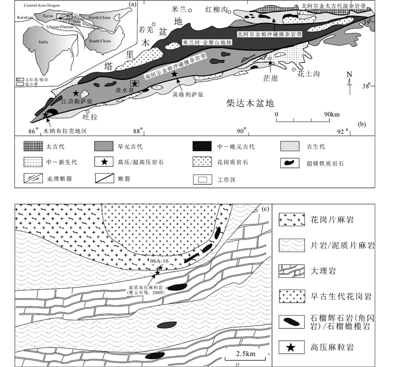 阿尔金构造带为青藏高原的北部边界,介于塔里木板块、柴达木板块以及祁连、东昆仑造山带之间(图 1a),是中国西部主要大地构造单元的衔接地带,该造山带是由早古生代古板块(或地块)之间相互俯冲-碰撞形成的复杂构造带,后来又被中-新生代以来的走滑断裂系改造(车自成等,1998; 刘良等,1999; Zhang et al., 1999,2001; 许志琴等,1999),自北向南依次可划分为北阿尔金太古代混杂岩带、北阿尔金俯冲碰撞杂岩带、米兰河-金雁山地块和南阿尔金俯冲碰撞杂岩带四个构造单元(图 1b)(Liu et al., 2009)。