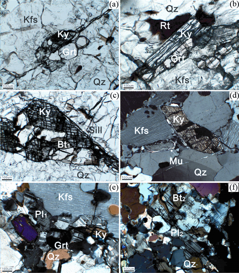 蓝晶石 板柱状,多发育两组解理(图 2b),与石榴石、钾长石平衡共生,并呈变斑晶与石榴石和钾长石一起分布在基质中(图 2a-d)。蓝晶石的边部均发生不同程度的退变,部分退变为夕线石和黑云母(图 2c),部分边部被白云母所替代(图 2d),这些退变矿物分隔了蓝晶石、 石榴石和钾长石 斑晶。