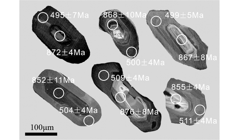 利用LA-ICP-MS锆石U-Pb定年方法,对片麻岩中的锆石共进行27次分析,锆石的U-Pb同位素测量结果在谐和曲线上形成了两个年龄密集区(图 5b、表 3)。其中18个核部测点构成了一个年龄密集区,其206Pb/238U的加权平均年龄为866±5Ma,应代表其原岩的形成年龄;5个边部测点形成另一个年龄密集区,206Pb/238U的加权平均年龄为505±5Ma,结合锆石的CL图像和微量元素特征分析,该年龄值应代表花岗质高压麻粒岩的峰期变质年龄。另有两个年龄位于上述两组年龄之间,考虑到锆石内部结构的复杂性,测点束斑(30μm)可能包含了不同比例的锆石残核与幔部,为混合年龄,不具有明确的地质意义。