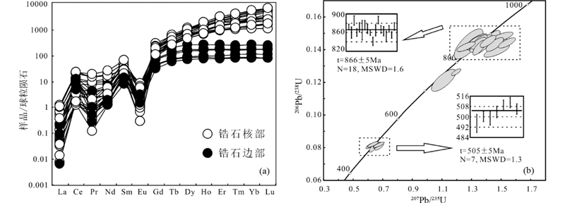 ![]() | 图 5 淡水泉花岗质高压麻粒岩中锆石的球粒陨石标准化稀土配分图(a,标准化值据Sun and McDonough, 1989)及U-Pb年龄谐和图(b) Fig. 5 The chondrite-normalized REE pattern(a,normalization values after Sun and McDonough, 1989) and concordia diagram(b)of zircons from HP granitic granulite from Danshuiquan area |