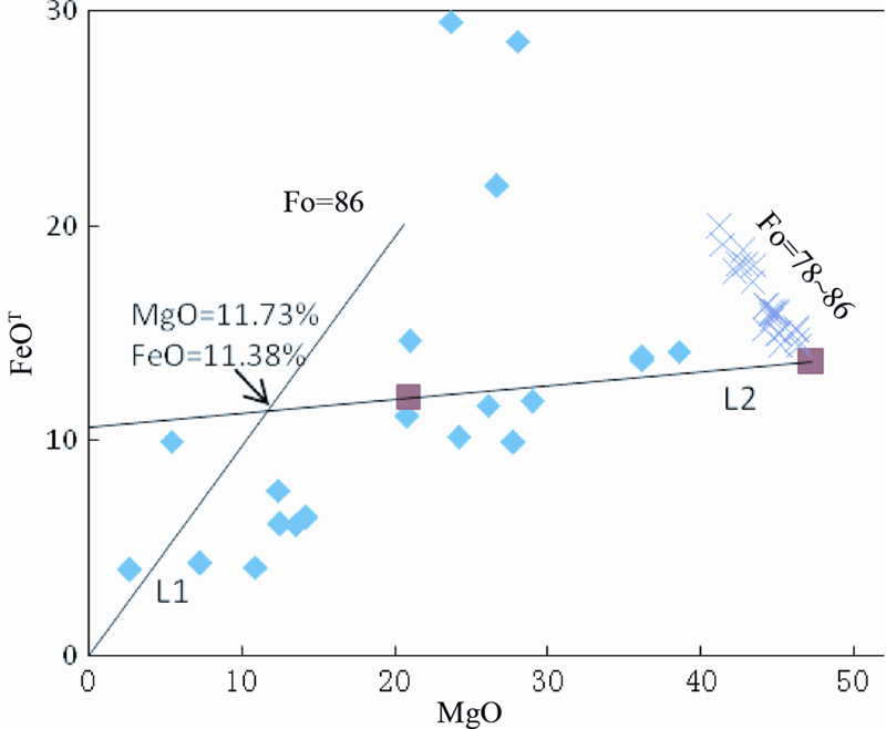 原始岩浆模拟计算过程如下:为排除致密硫化物、铬铁矿及地表风化蚀变等因素对计算结果的影响,模拟计算中所有样品硫化物样品了硫化物、铬铁矿含量大于5%的样品。温根南岩体中橄榄石最高Fo值为85.93(ZK0-4-20),推测共存熔体的MgO/FeOT=1.03(质量百分数比),得到线L1。而钻孔样品MgO/FeOT=1.6~2.8,均大于共存熔体的1.03,所以任一温根南岩体中的堆晶岩既不能代表原始岩浆,也不是岩体的平均化学成分,而是结晶分异过程中富镁矿物(橄榄石)结晶后堆积的结果。