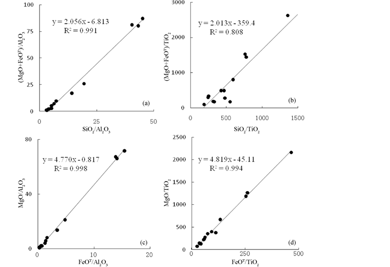 对原始岩浆结晶分异过程进行检查,我们应用元素比值图解MPR法(Pearce,1968; 陶琰等,2002)。橄榄石中mol%(MgO+FeO)/SiO2=2.06~2.13,平均值为2.10,与图 11a,b中趋势线斜率2.05、2.01相近。图 11c,d中斜率均为4.8反映的是控制岩石组成的橄榄石中MgO与FeOT的摩尔比值,对应的Fo=83,与橄榄石电子探针分析结果Fo=78.6~85.93范围一致。表明之前的假设成立,质量平衡方法可行。