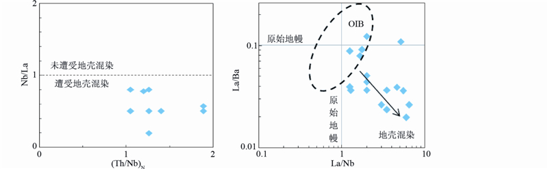 Zr、Y、Th、Ta等不相容元素的比值在地幔熔融及结晶分异过程中不发生变化,它们的含量也基本不受岩石变质作用的影响,因而可以用来判别岩浆形成演化,较高的原始地幔标准化Th/Nb比值(1)和低Nb/La比值(<1)是地壳混染作用的两个可靠的微量元素指标(Saunders et al., 1992; Kieffer et al., 2004)。在地壳混染判别图解中(图 12),温根南岩体样品全部落于遭受地壳混染范围,表明岩浆在上升过程中已遭受地壳混染。