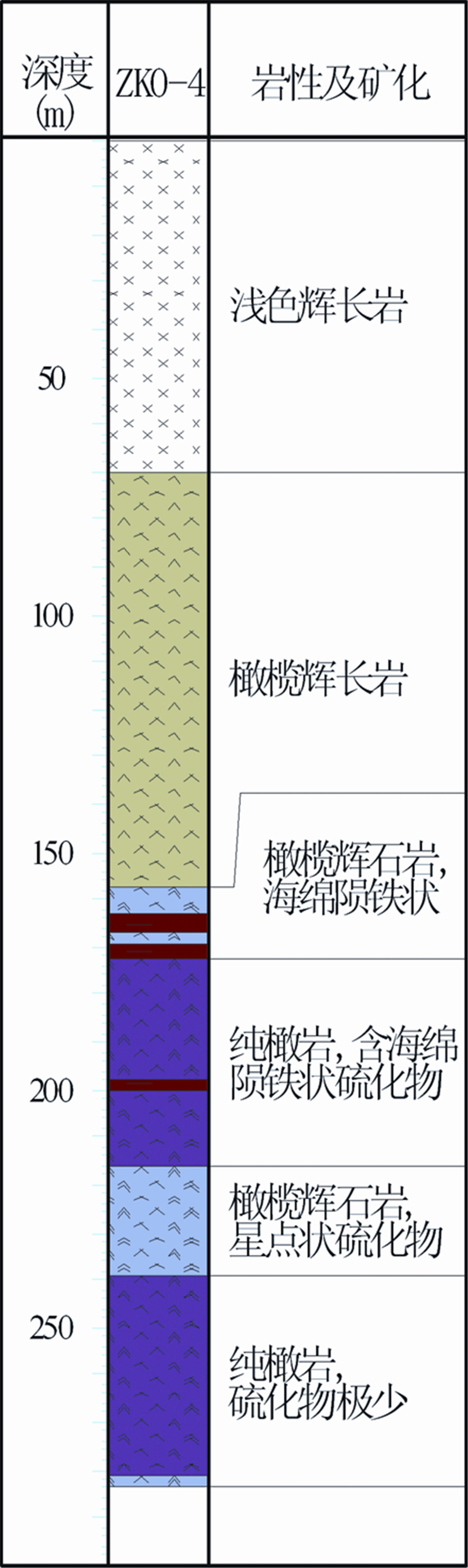 温根南岩体平面上近NNE向延伸,呈近椭圆形,面积3.92km2。岩体东北部较低,西北部分和南部海拔最高,西南部分海拔最低,最大高差约200m,立体上呈向西南倾斜的半漏斗状。温根南岩体为温根地区基性程度最高的岩体(图 1),地表主要由辉长岩-橄长岩-纯橄岩-角闪岩等组成,显示了复式岩体特征,以粗粒辉长岩面积较大,韵律层不明显。岩体中心钻孔编录得知岩体纵向上,由下向上岩性分布大致为纯橄岩(图 2;钻孔ZK0-4,打穿岩体证实纯橄岩相为岩体结晶分异中的最早产物),岩石呈黑色致密状,表面细腻,去除硫化物后,橄榄石含量90%以上,颗粒直径在0.5~3.0mm之间;橄榄辉石岩,单斜辉石含量为30%~70%,橄榄石含量为30%~70%,斜方辉石含量为1%,单斜辉石围绕橄榄石生长,包橄结构明显,与纯橄岩呈渐变过渡关系(图 3e);橄长岩,斜长石粒径0.5~2cm,橄榄石含量为20%~60%,斜长石含量为30%~70%,无斜方辉石(图 3d);橄榄辉长岩,橄榄石颗粒粗大,含量20%~50%,单斜辉石含量为15%~30%,斜长石含量为15%~60%,尖晶石含量为1%,含少量硫化物,地表见角闪石岩脉(图 3b)。浅色辉长岩相,为钻孔最上层岩相,岩性粒度多为中粗粒,颜色以浅绿色为主。矿物成分橄榄石含量在5%~10%之间变化,单斜辉石含量在5%~25%之间变化,斜方辉石含量在5%~10%之间变化。