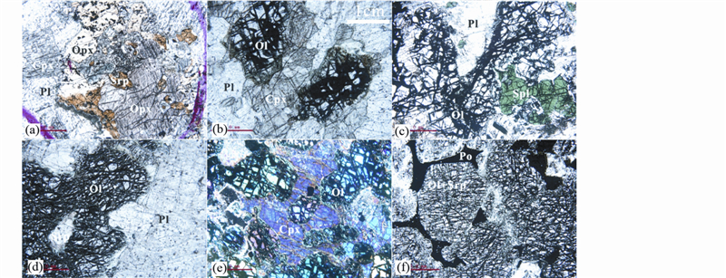 ![]() | 图 3 温根南区不同岩相薄片照片 (a)-辉长苏长岩;(b)-橄榄辉长岩(包橄结构);(c)-含尖晶石橄榄辉长岩;(d)-橄长岩;(e)-单斜橄榄辉石岩(包橄结构);(f)-含硫化物纯橄岩(半海绵陨铁状). 除(e)为正交偏光下,其余为单偏光下.Ol-橄榄石;Opx-斜方辉石;Cpx-单斜辉石;Pl-斜长石;Srp-蛇纹石;Spl-尖晶石;Po-磁黄铁矿 Fig. 3 Microscope photos of rocks in southern Wengen,Inner Mongolian |
