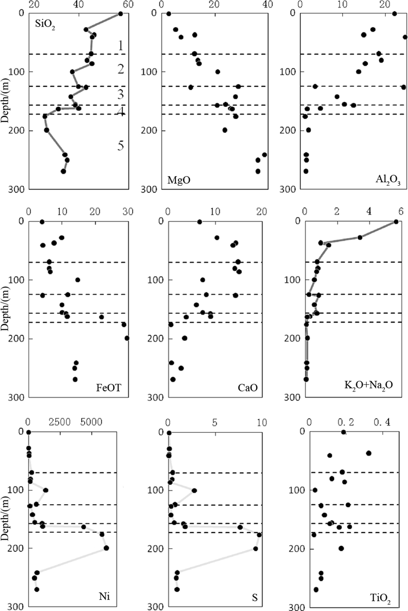 ![]() | 图 4 钻孔ZK0-4样品主要氧化物与深度的变化关系 1-苏长辉长岩;2-橄榄辉长岩;3-橄长岩;4-单斜辉石橄榄岩;5-纯橄岩 Fig. 4 Variation of major oxides and Ni,S with depth in the southern Wengen intrusion |