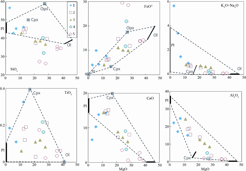 ![]() | 图 5 温根ZK0-4 MgO与主要氧化物关系图解 1-苏长辉长岩;2-橄榄辉长岩;3-橄长岩;4-单斜辉石橄榄岩;5-纯橄岩 Fig. 5 Diagram of MgO vs. major oxides in the southern Wengen intrusion |