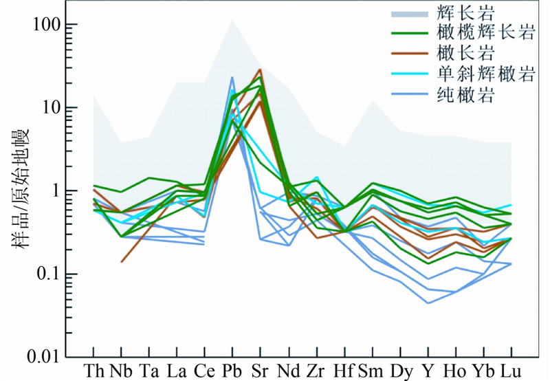 从微量元素蜘蛛图(图 6)上可知,温根南岩体样品中微量元素总体富集程度较低,具Nb(0.1×10-6~0.7×10-6)、Hf轻微亏损,Pb、Sr显著富集的特征。Nb、Ta的亏损程度轻微有可能是形成温根南岩体的母岩浆存在地壳物质的混染作用。Sr通常以类质同像出现在斜长石中,因而Sr异常反映出样品中斜长石的摩尔含量,而纯橄岩、单斜辉石橄榄岩等样品无Sr异常。