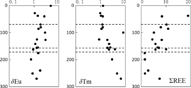 ![]() | 图 7 温根南岩体ZK0-4稀土元素随深度变化 Fig. 7 The variations of δEu,δTm,ΣREE with depth in the southern Wengen intrusion |