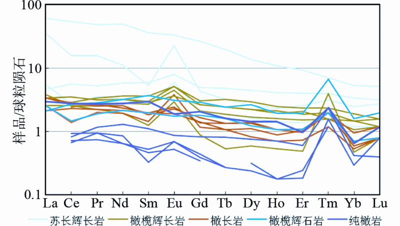 由图 7可见除纯橄岩相外均可见明显的Eu正异常,δEu为0.76~4.73,平均1.70,Eu极高的含量反映了斜长石在岩石中的含量变化。同时,含斜长石样品均表现出明显的Eu正异常,表明斜长石多数为堆晶过程的产物。除辉长岩相外都表现出明显的Tm正异常,δTm为0.89~8.22,平均2.55,其中含硫化物较多的样品相应的δTm均较高。