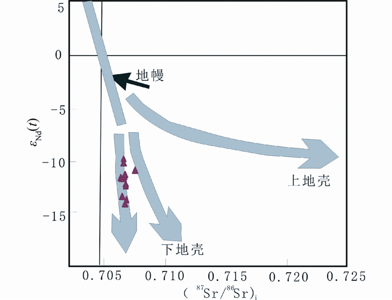 ![]() | 图 9 εNd(t)对初始的(87Sr/86Sr)i图解(据Jahn et al., 2000) Fig. 9 Plot of εNd(t)vs.(87Sr/86Sr)i(after Janhn et al., 2000) |