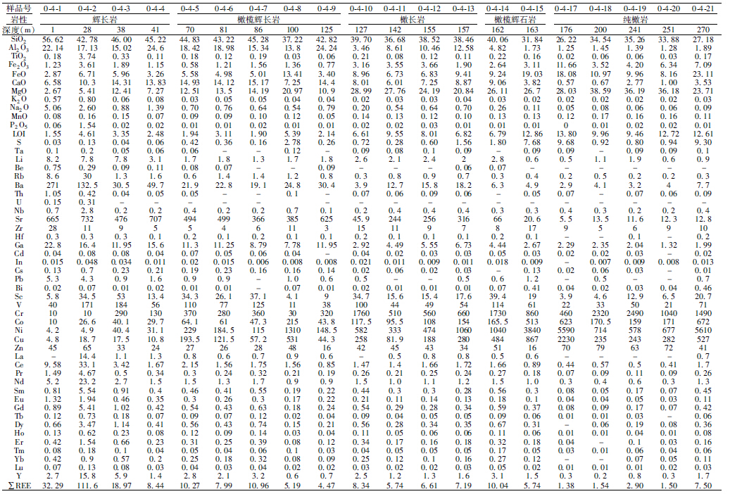 主微量元素分析结果见表 1。野外地质调查和室内岩石学研究显示研究区辉长岩类等属于堆晶成因,堆晶岩的主量元素变化是由岩石中堆晶的斜长石,橄榄石和残余熔体百分比控制的。由图 4主要氧化物含量变化可见,样品SiO2的含量总体较低,为26%~46%(部分样品硫化物含量达到10%左右导致SiO2极低)。MgO含量5.4%~38.6%,由图可见与深度的线性相关性较好,显示钻孔ZK0-4样品由超基性到基性演化的趋势,Mg#变化范围为0.39~0.77,多数样品Mg#值较高,平均为0.63,m/f=1~5,多数为铁质超基性岩(铁质超基性岩m/f=2~6.5),表明岩体的基性程度较高。橄榄岩-纯橄岩Al2O3含量1.3%~4.8%,橄长岩-橄榄辉长岩Al2O3含量为8.6%~24.6%,反映出岩体中斜方辉石较少,而较多的斜长石和单斜辉石对Al2O3含量的变化贡献较大。全碱K2O+Na2O总体较低,为0.06%~3.4%,多数样品含量小于1%。CaO含量变化较大,为0.6%~15.2%,钻孔中由深到浅CaO含量逐渐增大,反映了岩体中由深到浅橄榄石逐渐变少,而单斜辉石、斜长石增多的事实。160~200m范围内SiO2含量偏低,200m以下的三块样品均为含硫化物极少的纯橄岩,与其上呈过渡关系的含硫化物单斜辉石橄榄岩相比,表现为全铁低(14%左右)而镁高(36%~38%),单斜辉石橄榄岩中极高的全铁含量部分源于硫化物中Fe的贡献,同时硫化物含量的增大也压低了SiO2和MgO的绝对含量。表明纯橄岩中含硫化物极少而单斜辉石橄榄岩中硫化物含量突然增大的事实,推测单斜辉石的结晶与S的饱和同步。