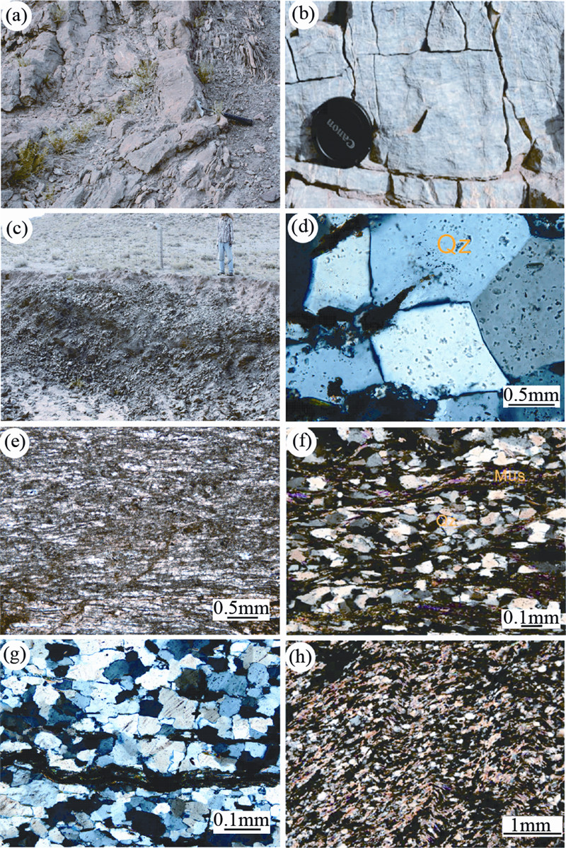 (a)中等变形强度的大理岩和石英岩;(b)片理化大理岩;(c)强变形的白云母石英砂岩;(d)石英的三联点结构;(e)为(b)的镜下照片;(f、h)为(c)的镜下照片;(g)为(a)的镜下照片 Fig. 4 The field and microscopic photographs of strong deformation zone (a)medium deformation marble and quartzite;(b)foliated marble;(c)strong deformation quartz s and stone;(d)triple junction of quartz;(e)microscopic photographs of(b);(f,h)microscopic photographs of(c);(g)microscopic photographs of(a) |