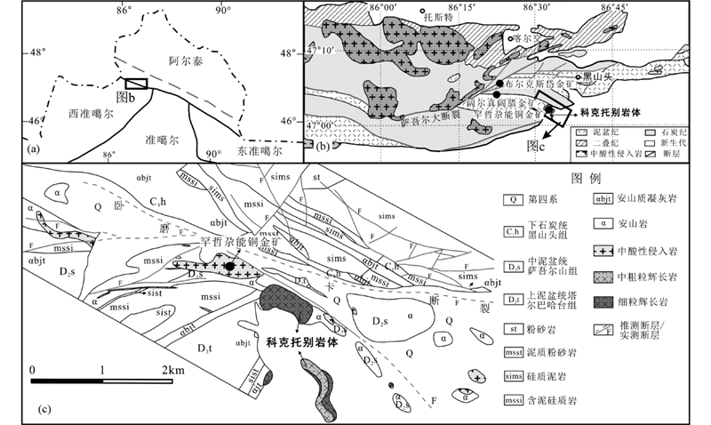 ![]() | 图 1 新疆北部构造分区图(a,据何国琦等,1995)、萨乌尔地区地质简图(b,据新疆地矿局区调大队第十分队,1981①)和科克托别岩体地质简图(c,据郭正林等,2010)Fig. 1 Tectonic zoning map of northern Xinjiang(a,after He et al., 1995),sketch geologic map of Sawuer region(b) and simplified geological map of the Keketuobie intrusion(c,after Guo et al., 2010) |