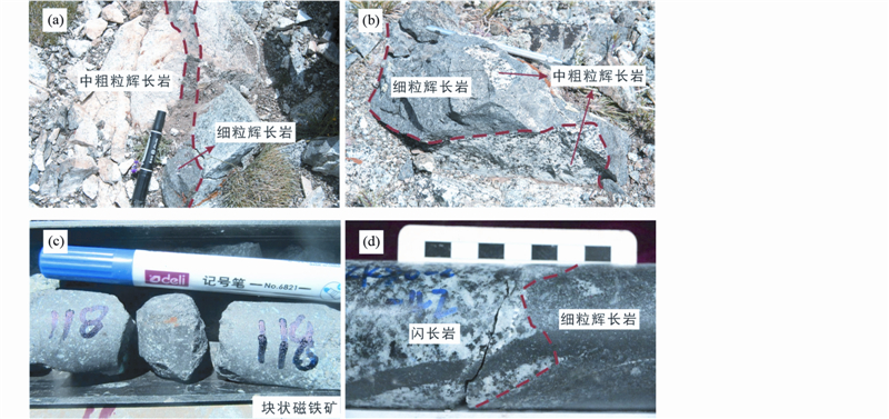 3 岩体的岩石学特征科克托别岩体位于萨吾尔东南部,岩体附近出露中泥盆统萨吾尔山组和上泥盆统塔尔巴哈台组地层,中泥盆统萨吾尔山组为安山玄武质集块角砾熔岩夹辉石安山岩、玄武岩、安山质凝灰岩及泥质粉砂岩,上泥盆统塔尔巴哈台组为泥质粉砂岩夹少量生物碎屑灰岩。岩体长约1.4km,宽300~400m,出露面积约0.5km2。根据岩相学特征岩体包括中粗粒辉长岩、细粒辉长岩和闪长岩(图 1c)。在野外露头显示中粗粒辉长岩和细粒辉长岩明显呈侵入接触关系,细粒辉长岩以脉状侵入中粗粒辉长岩中(图 2a),脉状细粒辉长岩中包裹有中粗粒辉长岩包体(图 2b),说明它们是两次不同的岩浆侵入形成,而且细粒辉长岩要晚于中粗粒辉长岩形成。在中粗粒辉长岩和细粒辉长岩中都含有磁铁矿,在细粒辉长岩底部可以见到20cm厚的块状磁铁矿(图 2c)。钻孔中可见闪长岩与中粗粒辉长岩呈渐变过渡接触关系,而与细粒辉长岩呈侵入接触关系,在细粒辉长岩中可见闪长岩包体(图 2d)。