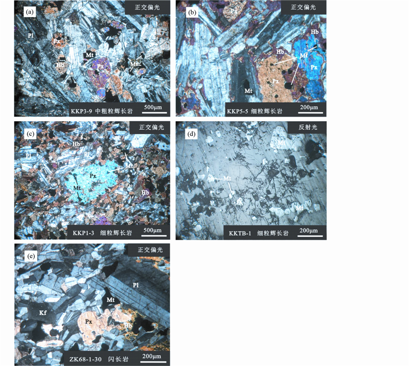 ![]() | 图 3 科克托别岩体岩石学特征 (a)中粗粒辉长岩的辉长结构;(b)细粒辉长岩辉石中的磁铁矿;(c)细粒辉长岩;(d)细粒辉长岩中磁铁矿;(e)闪长岩. Px-辉石;Pl-斜长石;Hb-角闪石;Kf-钾长石;Mt-磁铁矿Fig. 3 Texture photos of the rocks from Keketuobie intrusion(cross-polarized) (a)gabbro texture of the medium to coarse grained gabbro;(b)the magnetite in the pyroxene of the fine grained gabbro;(c)fine grained gabbro;(d)the magnetite in the fine grained gabbro;(e)diorite. Px-pyroxene; Pl-plagiclase; Hb-hornblende; Kf-potassium feldspar; Mt-magnetite |