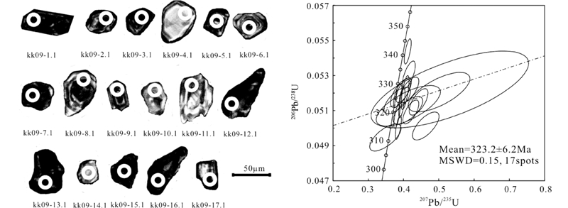 ![]() | 图 4 科克托别岩体细粒辉长岩锆石阴极发光图像和SHRIMP U-Pb年龄协和图Fig. 4 Cathodoluminescence(CL)images and SHRIMP concordia U-Pb diagrams of zircon from the fine grained gabbro in the Keketuobie intrusion |