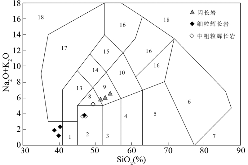 ![]() | 图 5 科克托别岩体岩浆/火成岩全碱-硅(TAS)岩石分类图(据Middlemost,1994) 1-橄榄辉长岩;2a-碱性辉长岩;2b-亚碱性辉长岩;3-辉长闪长岩;4-闪长岩;5-花岗闪长岩;6-花岗岩;7-硅英岩;8-二长辉长岩;9-二长闪长岩;10-二长岩;11-石英二长岩;12-正长岩;13-副长石辉长岩;14-副长石二长闪长岩;15-副长石二长正长岩;16-副长正长岩;17-副长深成岩;18-霓方钠岩/磷霞岩/粗白榴岩Fig. 5 Total alkali vs. silica classification diagram for the Keketuobie intrusive rocks(after Middlemost,1994) |