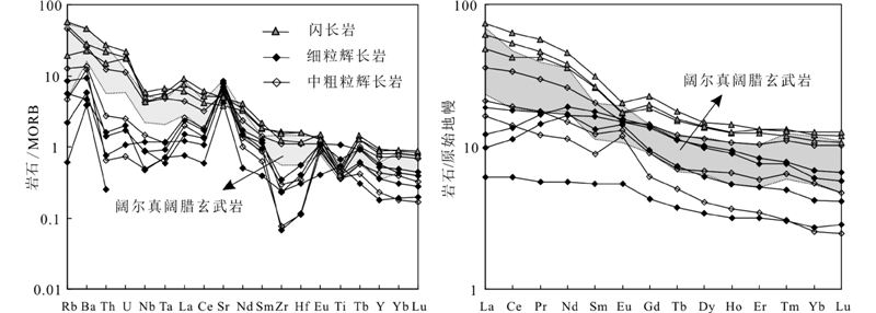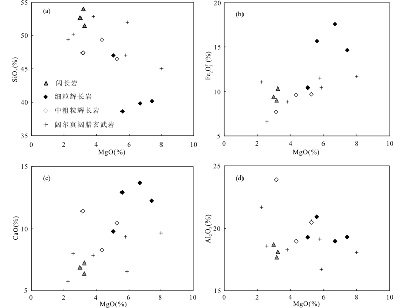 科克托别岩体中粗粒辉长岩和细粒辉长岩的主量元素和微量元素分析数据如表 2所示。在Middlemost et al.(1994)岩浆/火成岩全碱-硅岩石化学分类图解中(图 5),中粗粒辉长岩投影在辉长岩范围内,有1个样品投影在二长辉长岩范围内,为辉长岩向闪长岩的过渡岩石样品。大部分细粒辉长岩由于SiO2较低不投影在辉长岩范围内,闪长岩投点在二长闪长岩范围内。中粗粒辉长岩的SiO2含量为46.5%~49.3%,MgO含量在3.16%~5.26%之间;细粒辉长岩SiO2含量为38.6%~47.0%,MgO含量在5.06%~7.43%之间;闪长岩中SiO2含量为51.5%~54.0%,MgO含量在2.99%~3.24%之间。从细粒辉长岩、中粗粒辉长岩到闪长岩,样品中MgO、Fe2O3T、CaO含量依次升高,而SiO2含量依次降低(图 6),MgO与Fe2O3T、CaO、Al2O3呈正相关关系,而与SiO2呈反相关关系,与岩浆中辉石和斜长石的结晶分异有关。细粒辉长岩较低的SiO2和较高的Fe2O3T与岩石中辉石、角闪石、磁铁矿的堆晶作用有关,这与岩体岩相学特征一致。萨吾尔地区的阔尔真阔腊地区玄武岩主量元素与科克托别岩体中粗粒辉长岩相似,但相对于细粒辉长岩具有更低的CaO和Fe2O3T,更高含量的SiO2。