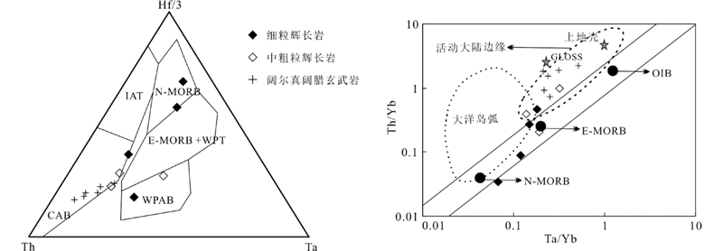 ![]() | 图 8 Hf/3-Th-Ta构造环境判别图(a,据Wood,1980)和Ta/Yb-Th/Yb相关图(b,据Pearce,1983) N-MORB-亏损型洋脊玄武岩;E-MORB-富集型洋脊玄武岩;CAB-火山弧钙碱性玄武岩;IAT-火山弧拉斑玄武岩;WPT-板内拉斑玄武岩;WPAB-板内碱性玄武岩Fig. 8 The Hf/3-Th-Nb/16 tectonic setting discrimination diagram(a,after Wood,1980) and diagram of Ta/Yb vs. Th/Yb(b,after Pearce,1983) N-MORB-normal-type oceanic ridge basalt; E-MORB-enriched oceanic ridge basalt; CAB-calc-alkali basalts; IAT-isl and -arc tholeiites; WPT-within-plate tholeiites; WPAB-within-plate alkaline basalts |