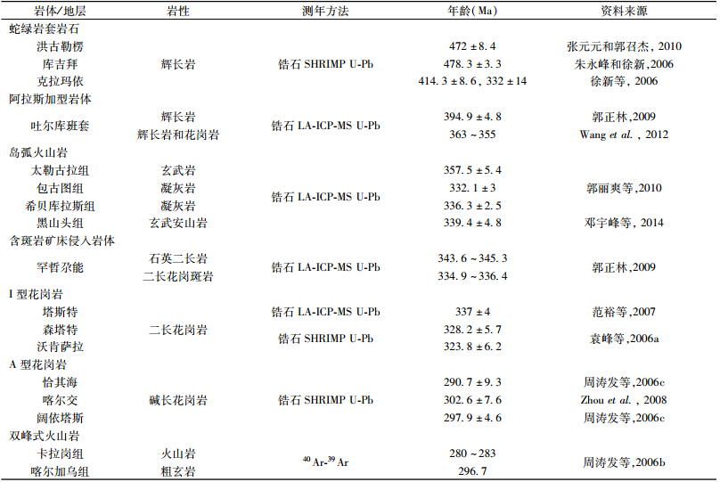 | 表 3 西准噶尔地区古生代岩浆岩同位素定年资料Table 3 Isotopic ages of the Paleozoic magmatic rocks in western Junggar |