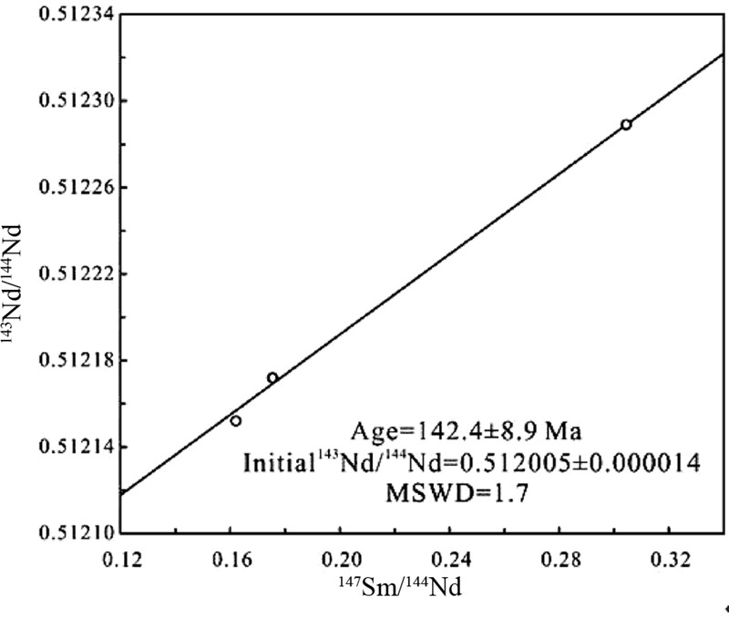3.3 白钨矿Sm-Nd定年结果 Sm-Nd同位素近年来己广泛应用于矿床学研究中,不仅可以示踪成矿物质来源,而且可以获得成矿时代,如矿石矿物白钨矿和硫化物等的Sm-Nd定年以及成矿期脉石矿物如萤石、碳酸盐等的Sm-Nd定年等(Jiang et al., 2000; Peng et al., 2003)。本文对大湖塘狮尾洞矿床3个白钨矿样品开展了Sm-Nd同位素定年,结果表明(表 2),白钨矿的Sm含量为0.69×10-6~4.35×10-6,Nd含量为2.57×10-6~14.97×10-6,147Sm/144Nd和143Nd/144Nd的变化范围分别为0.1622~0.3045,0.512152~0.512289。在147Sm/144Nd-143Nd/144Nd图解中(图 14),白钨矿样品表现出良好的线性关系,利用ISOPLOT程序计算获得的等时线年龄为142.4±8.9Ma(MSWD=1.7)。该年龄与丰成友等(2012)报道的狮尾洞矿床辉钼矿Re-Os年龄(140.9±3.6Ma)一致。