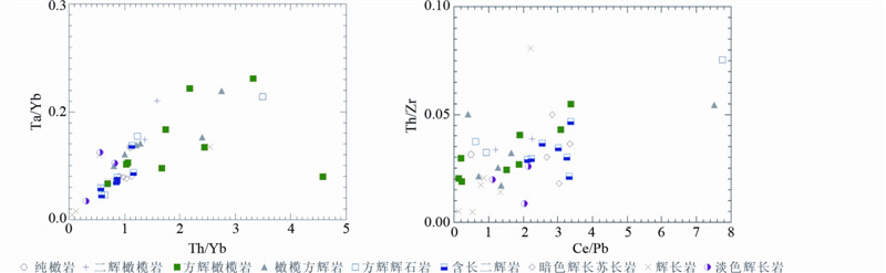 从元素地球化学角度来看,总分配系数相同或很相近的元素比值在岩浆结晶过程中不会改变。因此,根据总分配系数相同或很相近、对同化混染作用又敏感的元素比值(Ce/Pb、Th/Ta、La/Nb、Nb/Ta、Ta/Yb、K2O/P2O5、Ti/Yb、Zr/Nb等)之间的协变关系,可以检验是否存在地壳混染作用,并判断混染程度(Mecdonald et al., 2001; Baker et al., 1997; Campbell and Griffiths, 1993)。在同化混染作用判别图中(图 10),Ta/Yb-Th/Yb、Th/Zr-Ce/Pb均具有一定的相关性,表明岩浆演化过程中有一定的同化混染作用。
