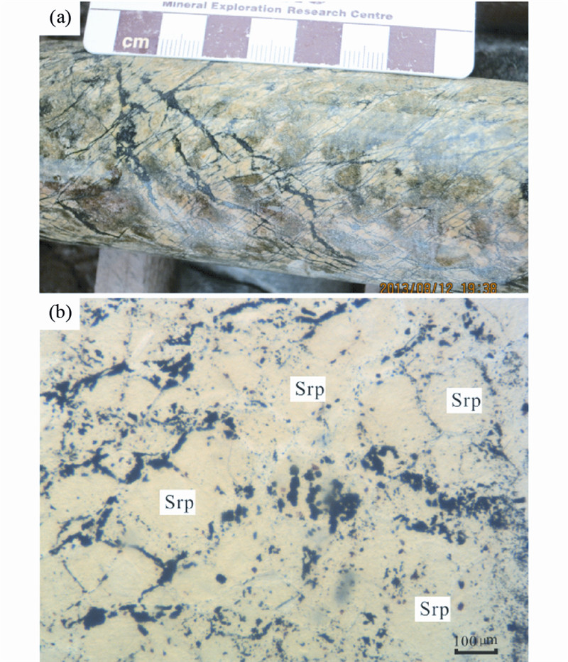 ![]() | 图 11 蛇纹岩岩芯照片及显微照片 (a)岩芯手标本照片;(b)蛇纹岩单偏光镜下显微照片Fig. 11 Photographs of serpentinite and petrographic thin section under polarized light from the No.Ⅲ intrusion (a)photographs of serpentinite;(b)petrographic thin section under polarized light |
