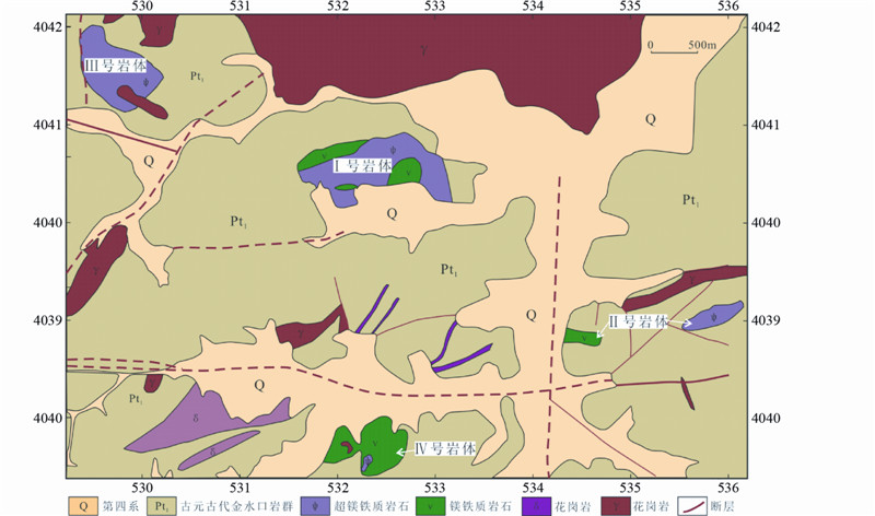 ![]() | 图 2 夏日哈木矿区岩体地质图Fig. 2 Geological map of Xiarihamu nickel deposit |