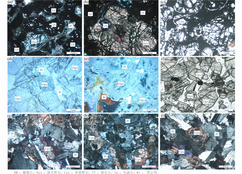 在辉长-苏长岩相中,暗色辉长苏长岩的主要结构类型为包含结构和堆晶结构,辉长岩和淡色辉长岩的主要结构类型为辉长结构,而橄榄辉长岩中既有辉长结构,也有包橄结构。堆晶相为橄榄石和斜方辉石,填隙相为单斜辉石和褐色普通角闪石、斜长石。见有斜长石和单斜辉石包裹自形斜方辉石和橄榄石,橄榄石包裹铬尖晶石。橄榄石和斜方辉石普遍有不同程度的蛇纹石化、滑石化,后者还有黑云母化。单斜辉石具有强的次闪石化,斜长石普遍有钠黝帘石化(图 4g-i)。