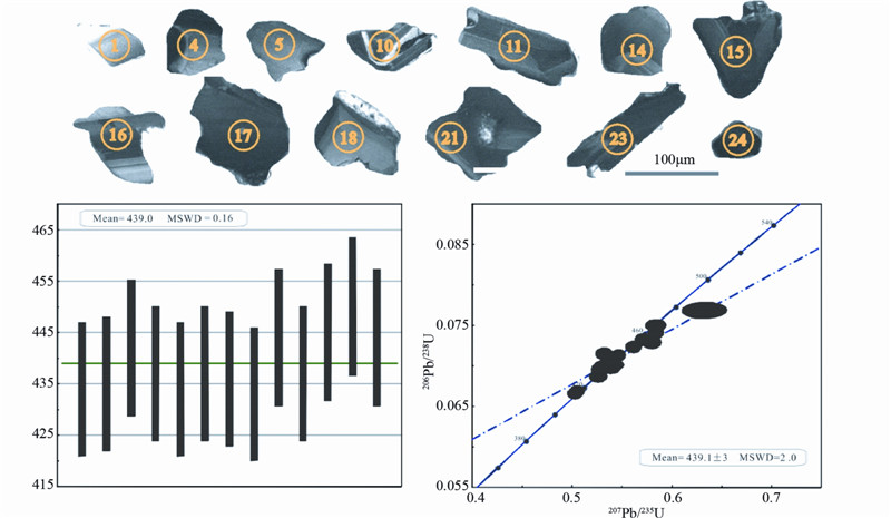 挑选的锆石多呈无色透明,在阴极发光(CL)图像(图 5)中较暗,应该是其Th、U含量高所致。所测锆石均具振荡环带,属岩浆成因锆石。206Pb/238U分析数据加权平均年龄为439.0Ma,MSWD=0.16;谐和年龄为439.1±3Ma,MSWD=2.0,两者年龄一致,属早志留世。