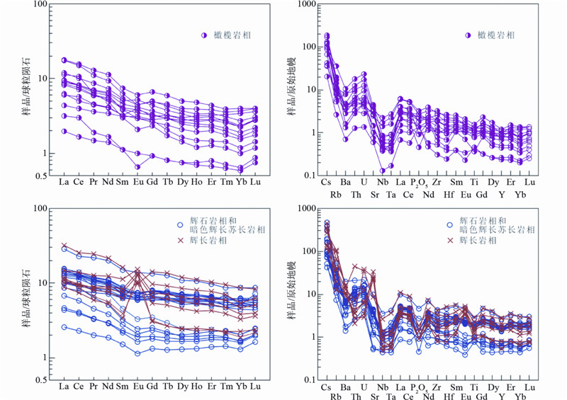 橄榄岩相、辉石岩相、暗色辉长苏长岩的主要结构类型均形成于不平衡结晶过程,属于平衡结晶过程的结构类型仅出现于橄榄辉长岩、辉长岩和淡色辉长岩中。由此可见,分离结晶作用主导了岩浆演化过程和岩体形成过程。只是到了岩浆演化的晚期阶段,分离结晶作用才逐渐退居次要地位,代表平衡结晶过程的辉长结构成为此阶段的主要结构类型。最主要的分离/堆晶相是橄榄石和斜方辉石。矿物结晶顺序是:尖晶石/橄榄石→斜方辉石→单斜辉石→单斜辉石+斜长石→褐色普通角闪石。
