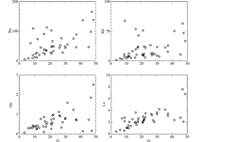 ![]() | 图 7 Ba、Rb、Nb、La与Zr相关图Fig. 7 Ba,Rb,Nb and La vs. Zr of No.Ⅰ intrusion |