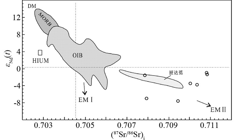 (4)各种岩石均具有典型的岛弧环境稀土元素与微量元素地球化学特征,Nd、Sr同位素组成属富集型地幔范畴,并显示了EMⅡ趋势。