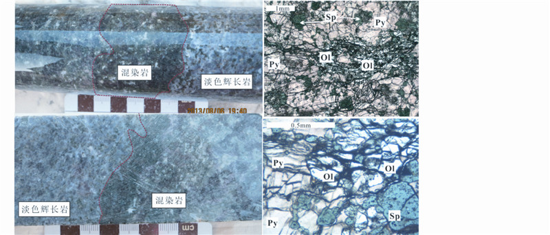 我们于2012年编录的Ⅰ号岩体ZK709号钻孔的淡色辉长岩中发现有一段40cm长的混染岩岩芯。该岩石已被岩浆强烈溶蚀改造,矿物组合已彻底改变,主要由斜紫苏辉石、绿色镁铁尖晶石、斜长石和少量橄榄石组成,各种矿物的分布极不均匀(图 9)。
