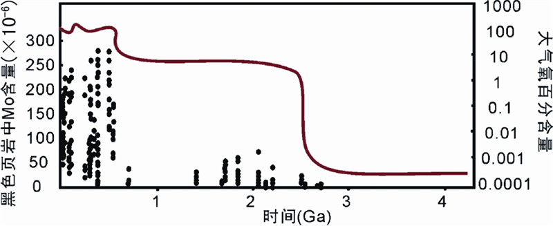 ![]() | 图 1 黑色页岩中钼含量和大气氧含量随时间的变化