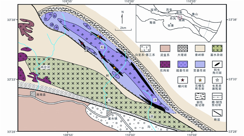 松树沟岩体是北秦岭造山带规模最大的一个镁铁-超镁铁质岩体,分布于陕西商南县富水镇以北,商丹构造带的北侧。岩体长约 27km,宽约2km,呈巨大扁长透镜体状产于秦岭群片麻岩中,透镜体的长轴方向与围岩片麻理一致(图 1)。其中超镁铁岩体分布于透镜体的核部,主要由橄榄质糜棱岩、中粗粒纯橄岩及少量方辉橄榄岩组成;镁铁质岩类主要由斜长角闪岩及少量呈透镜状产于其中的石榴石角闪岩(榴闪岩)和基性麻粒岩(刘良等,1995)组成,它们绕超镁铁岩体围成一圈,两者以构造关系相接触,在接触面发育滑石菱镁片岩(安三元等,1981)。围岩片麻岩主要为含不等量黑云母和角闪石的长英质片麻岩和大理岩等,部分长英质片麻岩保留了高压麻粒岩相变质作用的记录(刘良和周鼎武,1994)。其后,Liu et al.(2003,2013)又在这些长英质高压麻粒岩的石榴石中发现大量矿物的出溶结构,从而提出这些长英质片麻岩经历了超高压变质作用,是大陆地壳俯冲到200km以下地幔深度的产物。