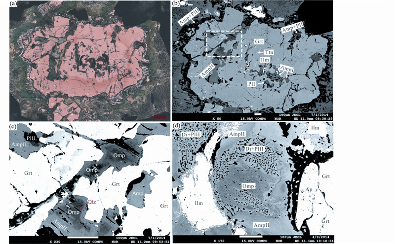 图 2 松树沟榴辉岩显微结构照片(a)和背散射照片(b-d) (a)石榴石的显微照片;(b)为(a)对应的背散射图像,石榴石不同部位包体矿物组成及后成合晶;(c)为(b)中方框的放大图,石榴石边部角闪石包体中残留的绿辉石;(d)基质中绿辉石及后成合晶 Fig. 2 Micrograph and BSE images of eclogite from Songshugou |