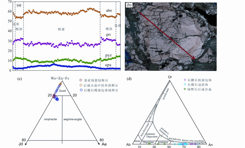 ![]() | 图 3 石榴石成分剖面(a、b)和单斜辉石(c,据Morimoto et al., 1988)及斜长石(d)分类图 Fig. 3 Composition profile of garnet(a,b) and types of clinopyroxene(c,after Morimoto et al., 1988) and plagioclase(d) |