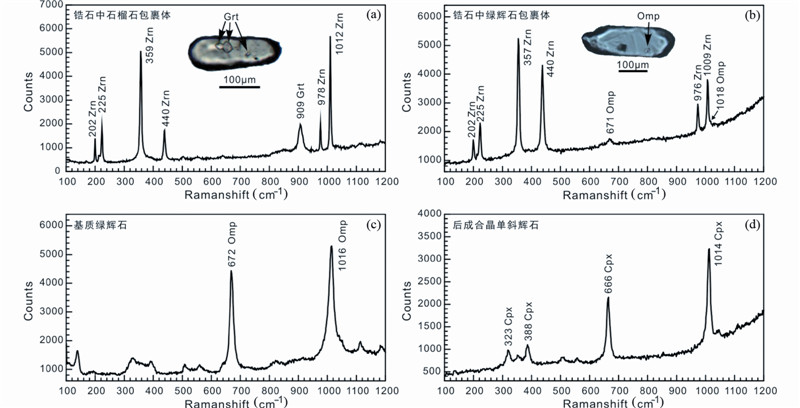 ![]() | 图 4 松树沟榴辉岩锆石中绿辉石包裹体、基质绿辉石及后成合晶单斜辉石拉曼光谱 Fig. 4 Raman spectra of omphacite inclusions in zircon,matrix omphacite and clinopyroxenes symplektite in Songshugou eclogite |
