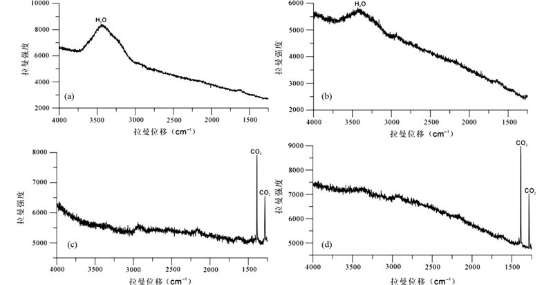 C型包裹体中,具有明显的的CO2特征峰(图 9c,d)。因此,尽管C型包裹体较少且很小,不易观察,但激光拉曼成分分析佐证了含CO2包裹体的存在。
