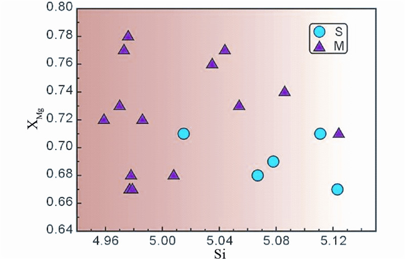 本文对上述不同类型的角闪石的化学成分进行了分析和总结,43个角闪石的化学成分如图 18所示,从此图中可以看出,依据Leake et al.(1997)分类原则,本区高压基性麻粒岩中不同成因类型的角闪石均为钙质角闪石大类,它们具有相近的CaO含量,变化于10.18%~12.67%之间。但是,它们的SiO2、Al2O3、MgO和FeOT含量却存在明显的差异,分别变化于39.52%~54.76%、2.52%~13.73%、5.59%~18.00%和9.03%~25.12%之间,相应的XMg值(=Mg/(Mg+Fe2+))为0.32~0.84,因此,在进一步区分钙质角闪石种属分类图解中,它们分别属于含铁韭闪石-含铁韭闪石质角闪石、浅闪石质角闪石亚类以及镁绿钙闪石-镁绿钙闪石质角闪亚类(图 18)。
