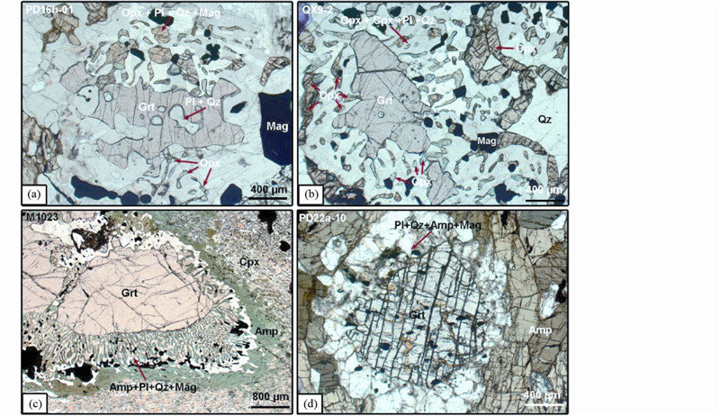 本区高压基性麻粒岩进入峰后近等温减压中-低压麻粒岩相退变质阶段以发生一系列的减压反应和斜方辉石的大量出现为标志。沿石榴石残晶边部常出现细粒蠕虫状的含斜方辉石后成合晶矿物组合,它们主要由紫苏辉石质斜方辉石(Opx)+透辉石质单斜辉石(Cpx)+富钙长石质斜长石(Pl)±富钛角闪石(Amp)所组成,偶见石英和铁-钛氧化物。上述蠕虫状后成合晶矿物围绕石榴石呈放射状生长,构成典型显微“白眼圈”结构,局部石榴石消失,完全被蠕虫状后成合晶替代,并具有石榴石假象(图 9)。