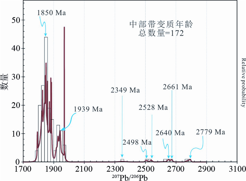 赞皇地区的斜长角闪岩和泥质片麻岩获得的峰期变质时代多数集中在1821~1868Ma之间(肖玲玲等,2011;Xiao et al., 2013,2014),个别长英质片麻岩样品中锆石记录了2507±15Ma的变质年龄信息(Xiao et al., 2014),该变质年龄代表的变质事件明显早于赞皇地区基底岩石~18.5亿年的大规模变质作用,而与东部陆块~25亿年绿片岩相-麻粒岩相区域变质事件时代相近。紧邻赞皇变质杂岩西缘的左权变质杂岩区,同样获得两组(~1900Ma和2464~2530Ma)变质年龄(肖玲玲,2014)。~2.5Ga的变质年龄在中部带内其它地区亦有报道,例如在阜平大柳树地区,程裕淇等(2004)通过锆石SHRIMP U-Pb年代学测试,获得长英质副麻粒岩的一组变质年龄为2538±14Ma,将其解释为麻粒岩相变质时代。